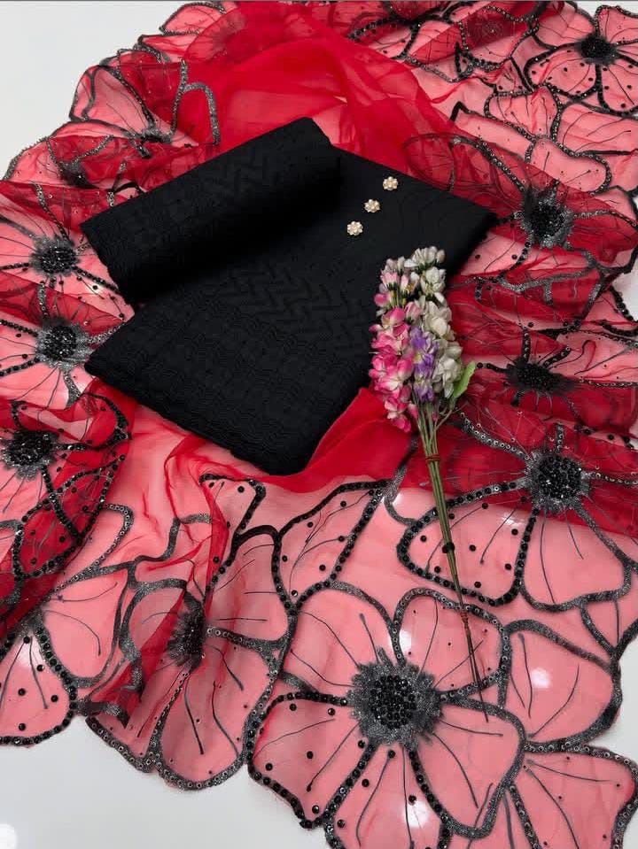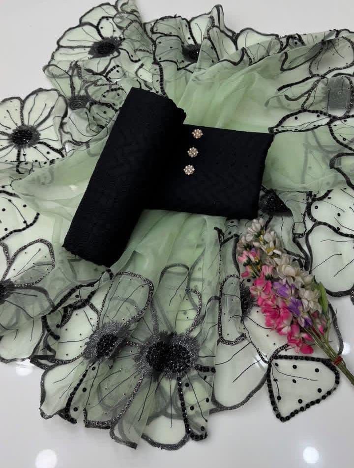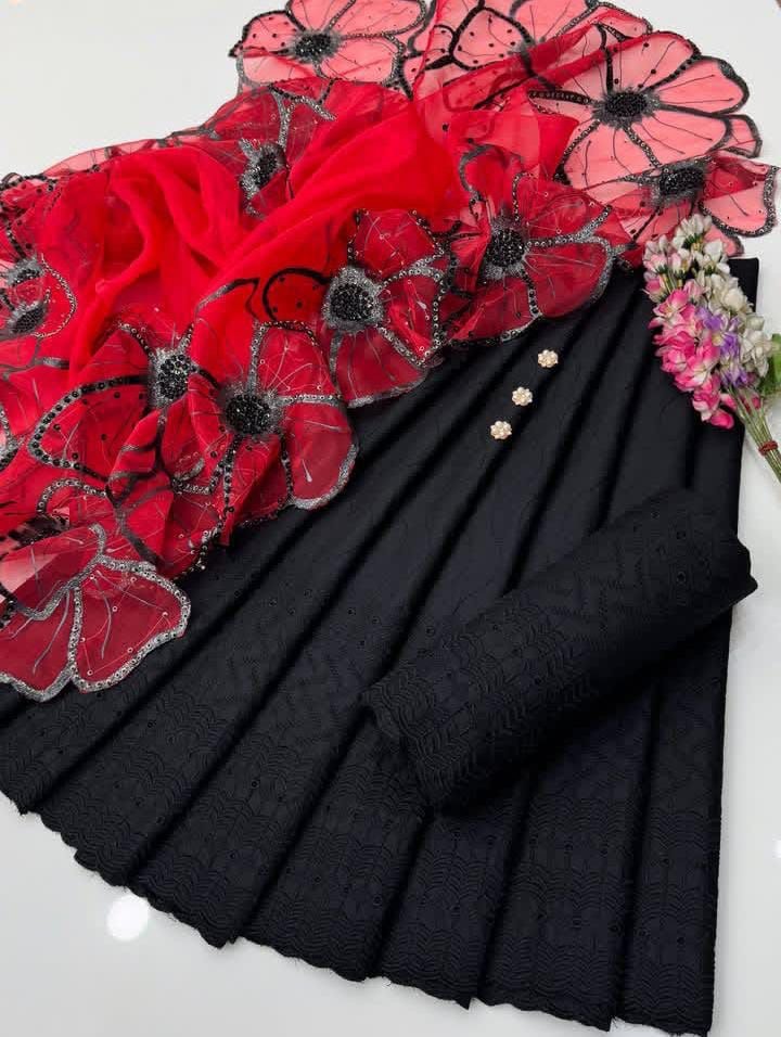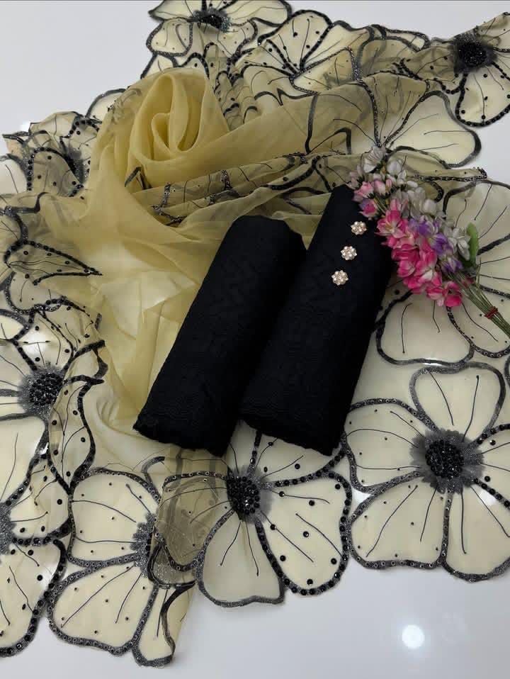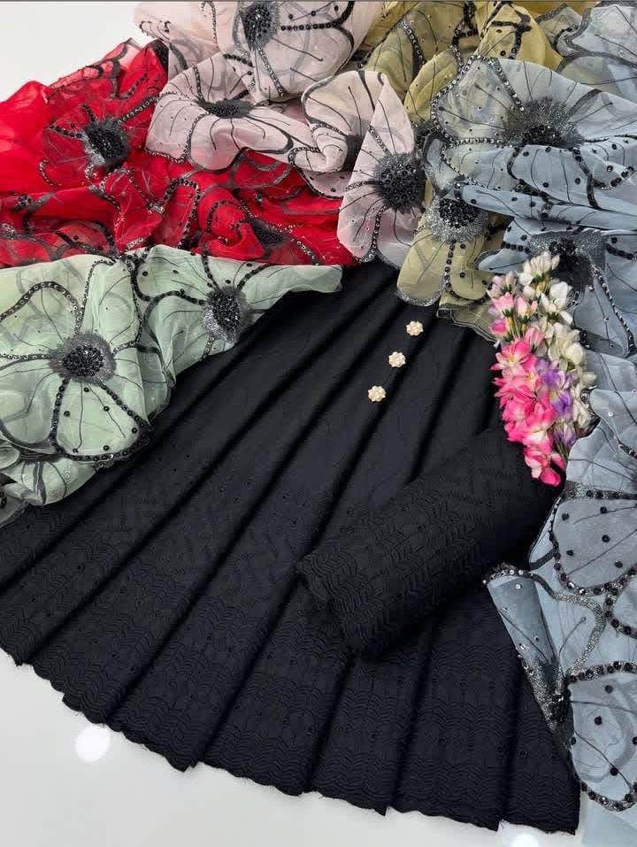 ✅Shiffile Chikankari Embroidery 🧵 Cotton Lawn Shirt & Trouser With Glitter Oil Paint 🎨 Sequence Beads 4Side Cutt Work Organza Dupata.